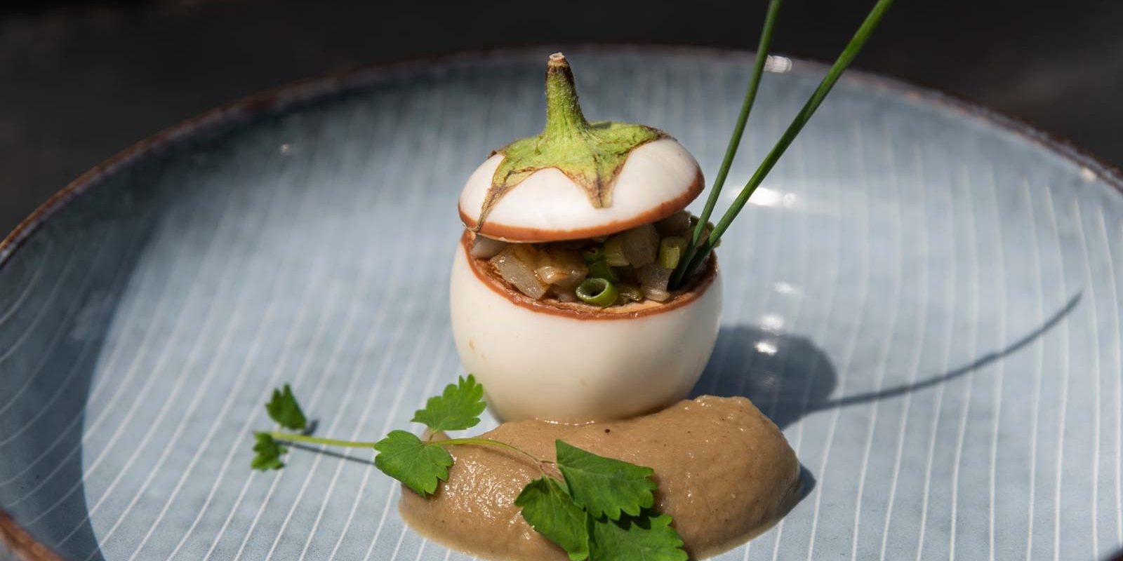 Aubergine mit würziger Füllung aus Zwiebeln und Paprika, dazu eine Creme aus asiatischen Auberginen